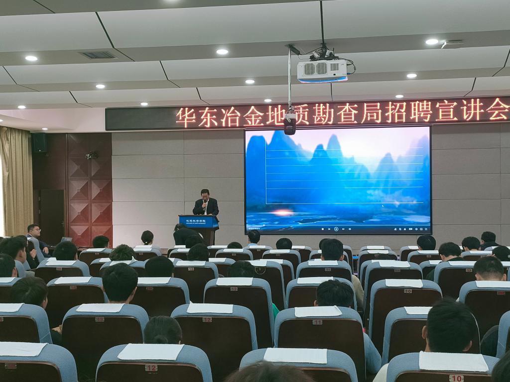 本次招聘会邀请的华东冶金地质勘查局是安徽省人民政府直属正厅级事业单位。招聘会上,华东冶金地质勘查局朱昆扬首先对学院的热情接待表示感谢,详细介绍了2024年局属各单位招聘计划和时间进度安排,并鼓励同学们积极投递简历,希望大家能加入到华东冶金地质勘查局的大家庭中。随后,华东地勘局下属八一一地质队、物探队的相关负责人介绍了单位的发展历史、晋升机会、薪资福利等情况。最后,参会的同学就自己关心的问题向招聘单位提出询问,在详细了解情况之后现场投递了简历。